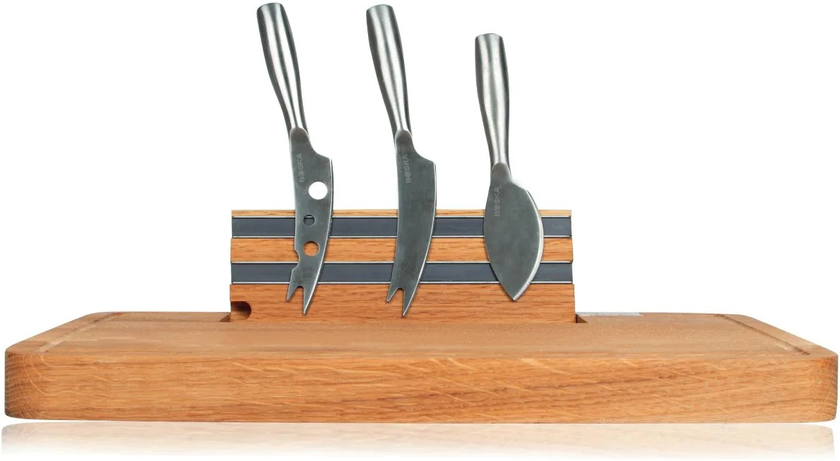Verras je familie en vrienden met de lekkerste kaas, tapas of andere (borrel)hapjes. Op deze plank van eikenhout ziet het er nog smaakvoller uit. Berg je messen na gebruik op in het handige opbergvak aan de onderkant. Of klik ze vast aan de magneetstrippen. Zo blijven ze mooi op hun plek en kun je er gemakkelijk bij.