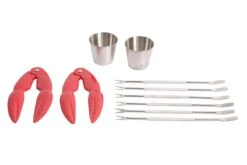 Dit is een handige set om de exclusieve smaak van kreeft op verfijnde wijze te proeven. De set bestaat uit 2 stevige tangen om de harde schaal van kreeft gemakkelijk te breken. 6 vorkjes waarmee u en uw tafelgezelschap op een elegante manier het vlees uit de kreeftenpoten kunnen halen. En 2 sauspotjes voor een torentje cocktailsaus bij gekookte kreeft of voor een remouladesaus wanneer u deze delicatesse grilt op de barbecue.