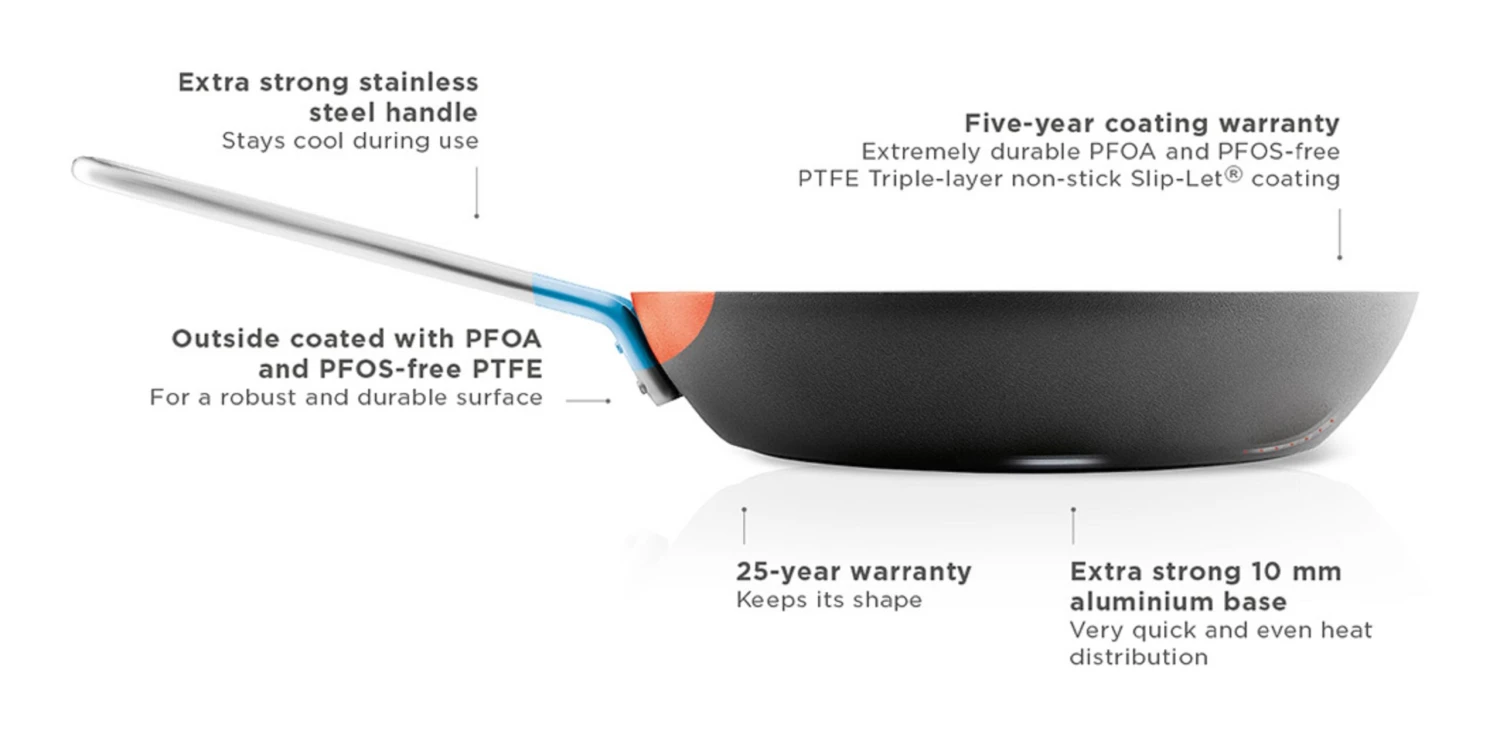 De koekenpan is PFOA en PFOS-vrij en is ovenbestendig tot 260 graden Celsius. Ook zit er een garantie van 25 jaar op de bodem van de pan dat hij zijn vorm behoudt. De koekenpan heeft een karakteristiek handvat zodat je hem gemakkelijk kunt ophangen. Na gebruik kun je de pan reinigen in de vaatwasser.