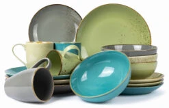 De Santorini serviesset van Jay Hill is afgewerkt met een “reactive glaze’, ofwel reactief glazuur. Dit houdt in dat tijdens het bakproces van het servies een chemische reactie plaatsvind. Deze reactie zorgt ervoor dat elk item van het servies een eigen uniek kleurpatroon krijgt. Hierdoor heb je zestien unieke borden, kommen en bekers. Groot is het verschil niet, het geheel past perfect bij elkaar! De speciale afwerking van het servies heeft geen invloed op het gebruik. Het servies kan gewoon in de vaatwasser en magnetron.