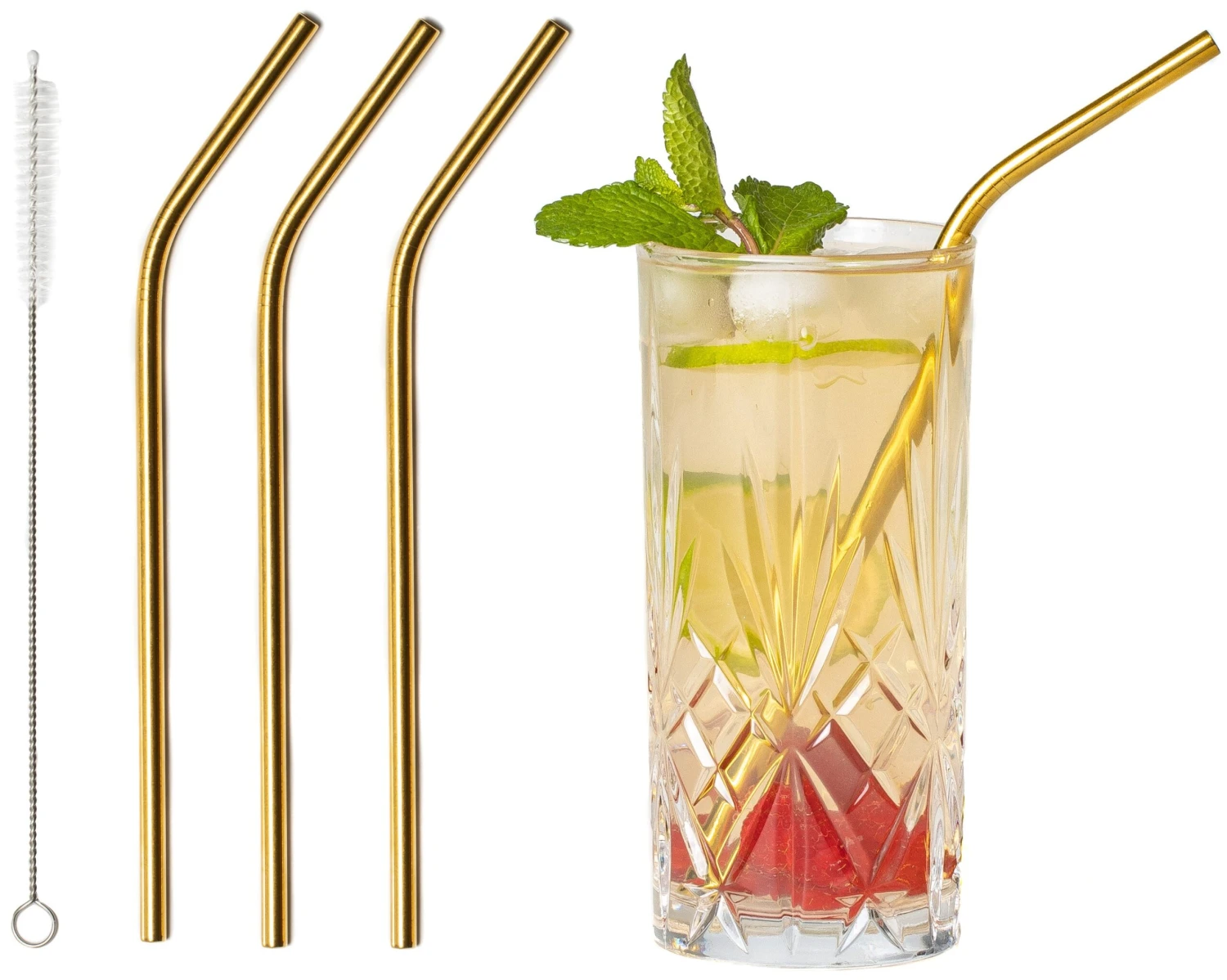 Zijn kartonnen en plastic rietjes die slap worden ook zo’n ergernis voor jou? Dat snappen wij helemaal. Met deze herbruikbare Cookinglife rietjes is een kartonnen smaak verleden tijd! Geniet optimaal van jouw drankje met deze gouden rietjes gemaakt van RVS. Deze rietjes van 21.5 cm zijn gebogen en daardoor ook geschikt voor het lagere glaswerk. De set bestaat uit 4 stuks.