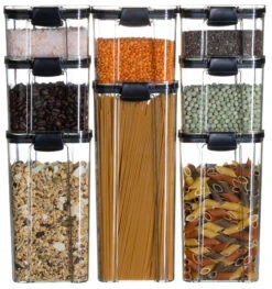 Met deze set voorraadpotten van Cookinglife berg je eenvoudig je etenswaren op, zodat deze vers en opgeruimd zijn. De voorraadpotten zijn transparant met transparante deksel, waardoor je zicht hebt op de inhoud en hoeveelheid, ook in de keukenla! Na gebruik kunnen de potten makkelijk gereinigd worden met de hand en ze zijn ook nog eens stapelbaar. De set bestaat uit 8 verschillende voorraadpotten met deze afmetingen: