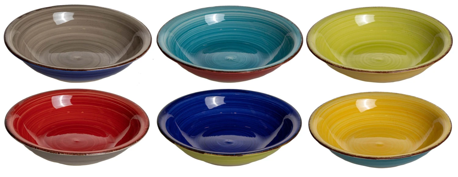 Elk dinerbord, diepe bord en ontbijtbord bestaan uit de volgende kleuren zoals u op de foto ziet: geel, donkerblauw, grijs, rood, lichtblauw en groen.